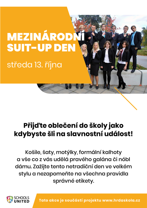 Naše škola ožila šarmem a elegancí. Ve středu 13. října 2021 se u nás ve škole uskutečnil Suit-up day. Připojili jsme se tak k projektu Hrdá škola od School United. Naši žáci a žákyně si vyzkoušeli vyučování ve společenském oděvu. Vyfotili se ve fotokoutku a zažili, jaké je to hodit se do gala.