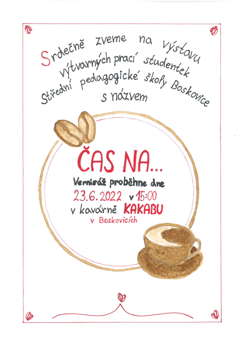 Srdečně zveme na výstavu výtvarných prací studentek naší školy ,,Čas na...” . Vernisáž výstavy proběhne ve středu 22. 6. 2022 v 15:00 v kavárně Kakabu v Boskovicích. Výstavu bude možné navštívit poté během července. Těšíme se na vás.