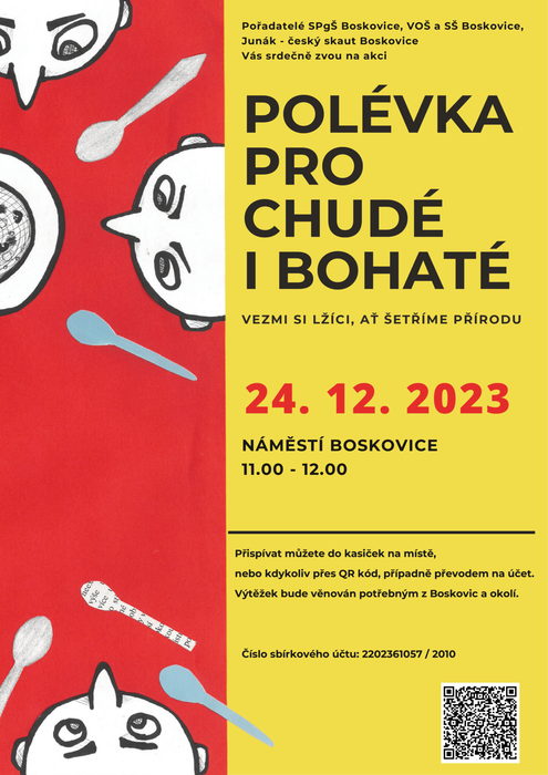 K vánočním tradicím v Boskovicích patří už od roku 1995 polévka pro chudé a bohaté, akce, která přináší do končícího roku světlo, a to jak v symbolické, tak i ve skutečné rovině. Je to tradice přátelského setkávání a také získávání finančních prostředků pro dobročinné účely, která se po dvouleté covidové odmlce loni opět vrátila a přinesla rekordní zisk 92 962 Kč. Tyto peníze byly rozděleny dvěma dětem, jejichž těžké zdravotní problémy vyžadují péči a podporu v oblastech, které hradí rodiny z vlastních zdrojů. Uvedené finance byly loni využity na nákup elektrického invalidního vozíku, fyzioterapie, hipoterapie, neurorehabilitace a k lázeňským rehabilitačním účelům.
