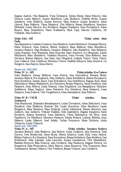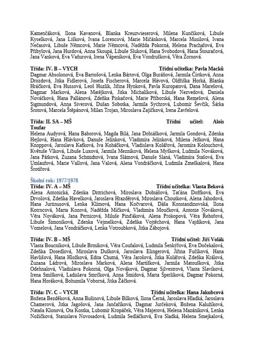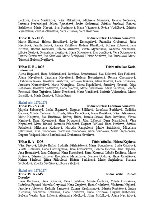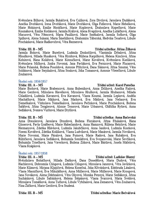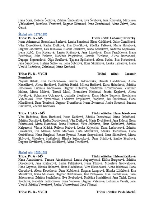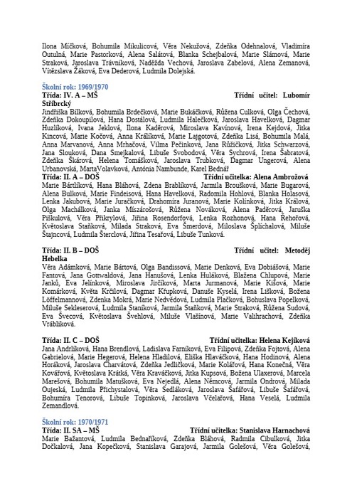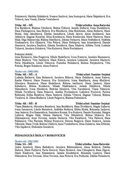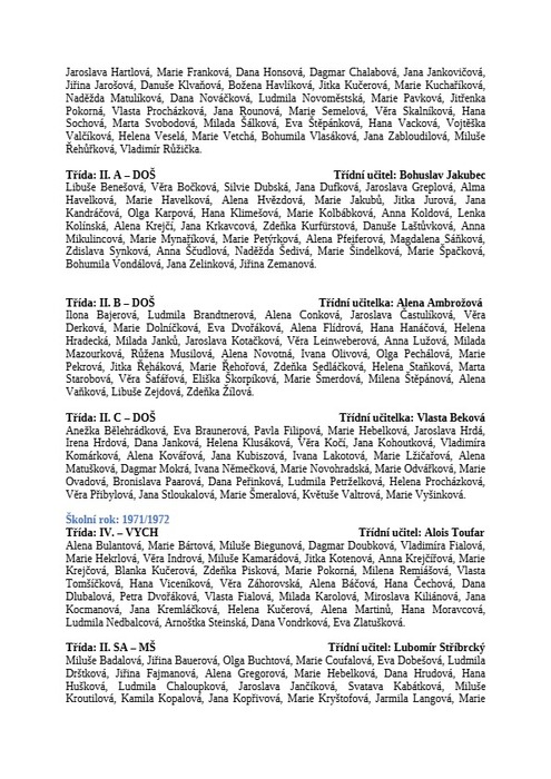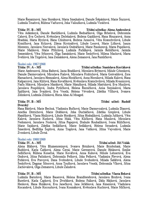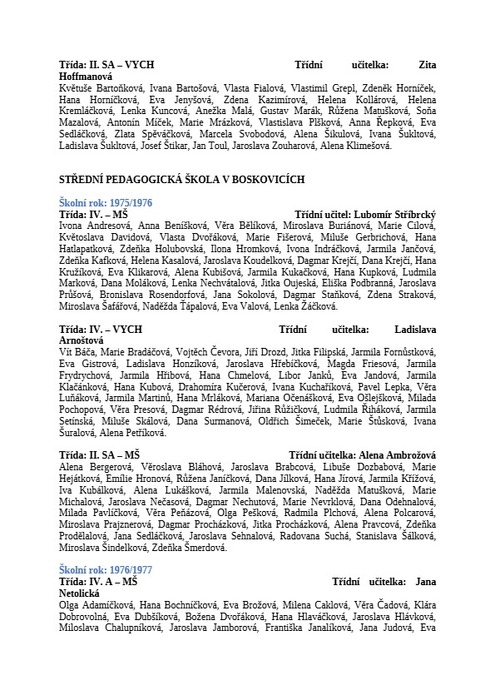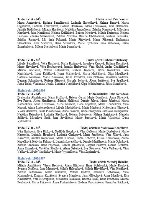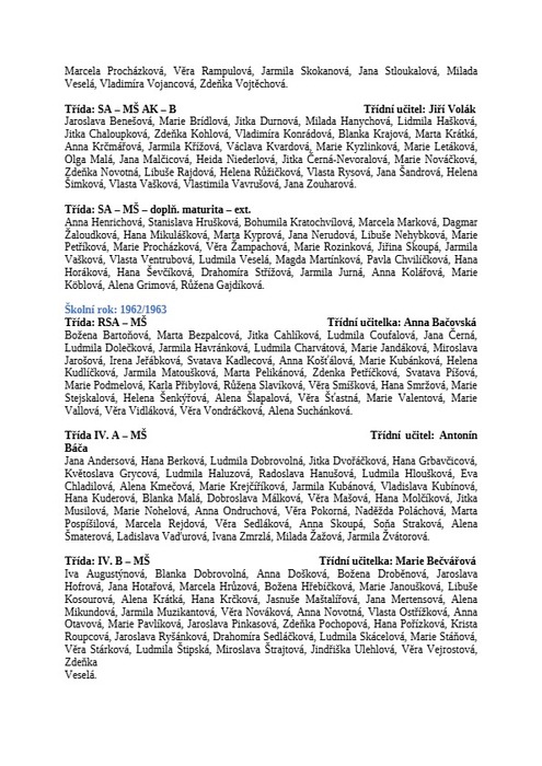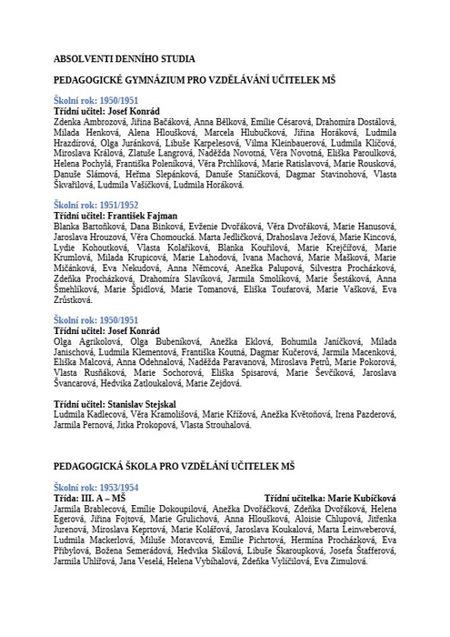 ABSOLVENTI DÁLKOVÉHO STUDIA Školní rok: 1960/1961 Třída: III. – DS Třídní učitel: Rudolf Dvorský Podzimní období: Vlasta Brodská, Jindřiška Budilová, Julie Čechová, Marie Čechovská, Jarmila Čižinská, Pěva Frišová, Václava Fiaudová, Marie Grossová, Milada Havelková, Zdenka Hansová, Božena Hofmanová, Marie Kalová, Blanka Kolářová, Zdeňka Kobylková, Marie Kostelková, Jana Malíčková, Eva Moravcová, Jaroslava Nečasová, Marie Slánská, Milada Odehnalová, Růžena Šenková, Marta Prokešová, Marie Buriánová, Eva Furchová, Milada Hejlová, Krista Holanová, Anna Kovářová, Jitka Kučerová, Štěpánka Buriánová, Vlasta Minaříková, Věra Srbová, Věra Štefková, Marcela Šustková, Pěva Täuberová, Ludmila Malčicová. Školní rok: 1962/1963 Třída: IV. A + IV. B – DS Třídní učitel: Antonín Báča Zdenka Coufalová, Zdenka Gottwaldová, Květoslava Hanzálková, Vlasta Holzerová, Jitka Hrazdírová, Ludmila Kalábová, Libuše Moláčková, Vlasta Ondrůjová, Kamila Pokorná, Alena Procházková, Blažena Prudká, Růžena Seitlová, Vlasta Slezáková, Marie Sýkorová, Helena Šíblová, Ludmila Tesařová, Marcela Vysoká, Milada Blinkalová, Milada Horáková, Ludmila Houzarová, Františka Hrůzová, Jarmila Chmelaříková, Božena Jarošová, Marie Kosíčková, Magda Kučerová, Marie Lajsová, Marie Láníková, Anna Malachová, Zdeňka Měřičková, Božena Pelantová, Naděžda Ruibarová, Ivana Ryšavá, Marie Svobodová, Marta Šiková. Třída: AK – DS Třídní učitel: Jiří Volák Podzimní období: Danuše Cupáková, Jarmila Černá, Marie Jedličková, Ludmila Kovaříková, Anna Lanžhotská, Dagmar Melkusová, Milena Švejcarová, Dobroslava Píčová, Krista Rajlichová, Eliška Schneiderová, Marie Šmidrkalová, Jana Šoustarová, Jitka Vágnerová, Alena Vodičková. Školní rok: 1963/1964 Třída: IV. + RSA – DS Třídní učitelka: Marie Bečvářová Věra Tobiášová, Božena Bárková, Ludmila Berková, Věra Hudečková, Marie Jarůšková, Miloslava Krejčová, Alice Kubíčková, Drahomíra Nebojsová, Jindřiška Pokorná, Anna Říhová, Hana Skládanková, Jaroslava Strouhová, Božena Šimková, Zdena Theimerová, Věra Kaňová, Ladislava Kučerová, Jaroslava Volejníková, Jana Antošová, Anežka Fillová, Zdena Gabčanová, Věra Hamerská, Anděla Jiráská, Irena Jurková, Květoslava Knotková, Jaroslava Mahelová, Zdenka Otevřelová, Irena Slavíková, Josefa Šukltová, Eva Truhlářová, Květa Zahradníčková. Školní rok: 1964/1965 Třída: IV. – MS – DS Třídní učitelka: Jiřina Žilková Marie Brechtová, Alena Césarová, Marie Fialová, Marie Kotrbová, Zdenka Kovářová, Marie Krahulcová, Marie Králová, Žofie Kratochvílová, Miroslava Krmíčková, Ludmila Pešíková, Karla Radkovičová, Lydie Sekaninová, Bohumila Smrčková, Marie Sochorová, Jana Stanková, Marie Vorlíková, Alena Vykydalová, Anna Saitzová. Školní rok: 1965/1966 Třída: IV. – MŠ – DS Třídní učitel: Lubomír Stříbrcký Irena Adamcová, Naděžda Ailerová, Marie Brýblová, Jarmila Bezdíčková, Teresie Darmovzalová, Edita Dvořáková, Marie Havlátová, Božena Horáková, Miroslava Charvátová, Anna Matoušková, Božena Mlčoušková, Jiřina Navrátilová, Ivana Nemétová, Alice Novotná, Božena Ondroušková, Libuše Pavlová, Milada Sedláková, Bohumila Staníčková. Školní rok: 1966/1967 Třída: IV. – MŠ – DS Třídní učitel: Lubomír Stříbrcký Podzimní období: Emílie Čechová, Svatava Drochytková, Věra Filková, Eva Gottwaldová, Marta Lanžhotská, Květoslava Kotalová, Marie Kroupová, Zdeňka Kryštofová, Miroslava Malá, Františka Maszalová, Marie Mičánková, Anna Veselá, Ludmila Pechová, Božena Mikulášková. Třída: III. SAM – DS Třídní učitel: Petr Vavřín Podzimní období: Marie Bednářová, Helena Bělohoubková, Anna Černá, Milada Doležalová, Ludmila Dušková, Eva Jeřábková, Marie Medlíková, Miroslava Mikušková, Libuše Novotná, Dagmar Pazderková, Vlasta Pitlová, Rosemarie Hrazdilová, Irena Pořízková, Vítězslava Štefková, Marie Žluvová, Marie Petrlová, Anežka Halmová, Jarmila Pospíchalová. Třída: IV. VYCH – DS Třídní učitelka: Marie Bečvařová Dobroslava Čechová, Jaroslava Dundová, Miroslav Horký, Vlasta Horská, Božena Kubová, Vlasta Nečasová, Olga Oldřichová, Zdeňka Řeháková, Libuše Sedláková, Jiřina Vorlová, Božena Špiková. Školní rok: 1967/1968 Třída: III. – VYCH – DS Třídní učitel: Petr Vavřín Drahomíra Běhounková, Svatoslava Brauková, Irena Dostálová, Marie Dostálová, Zdeňka Fialová, Lidmila Holubářová, Vlasta Kadlecová, Zdeňka Křivinková, Stanislav Macalík, Věra Malčíková, Jitka Musilová, Božena Nedělková, Zugebarg Neumannová, Ludmila Obdržálková, Marie Paděrová, Květuše Ptáčková, Jitka Roznosová, Anna Radová, Ivona Rožková, Marie Sedláčková, Marie Schilbabová, Maja Staňková, Miroslava Stejskalová, Růžena Šimanová, Edita Vejskalová, Božena Havelková, Zdinka Parmová, František Okáč, Dana Řehořková. Třída: IV. – MŠ – DS Třídní učitel: Lubomír Stříbrcký Marie Bumbová, Vlasta Cihlářová, Marta Flaišingerová, Milada Duchnanová, Zdenka Hegarová, Drahomíra Herzánová, Marie Horníčková, Vlasta Houžvová, Ludmila Keselicová, Miloslava Lublová, Františka Nekvindová, Anna Pořízková, Dana Řehořková, Anežka Stanická, Františka Vašíčková, Anna Vévodová, Jiřina Zifčáková, Ludmila Zouharová, Věra Veselá, Irma Burešová, Marie Čumrová, Věra Dvořáčková, Marie Nováková, Olga Procházková, Vlasta Smékalová, Marie Šulová, Jiřina Zbořilová, Radomír Hrbek, Olga Vrtílková, Vlasta Sedláková. Školní rok: 1968/1969 Třída: III. SA – VYCH – DS Třídní učitel: Jiří Volák Vlasta Krejčí