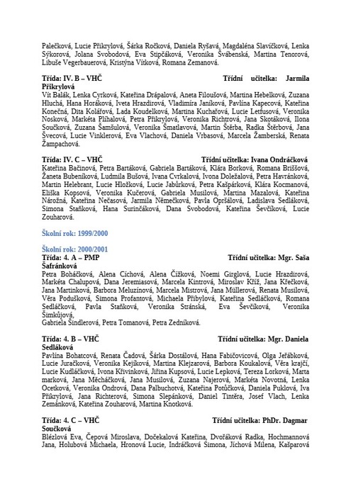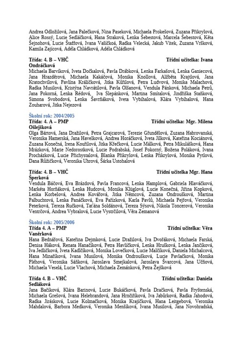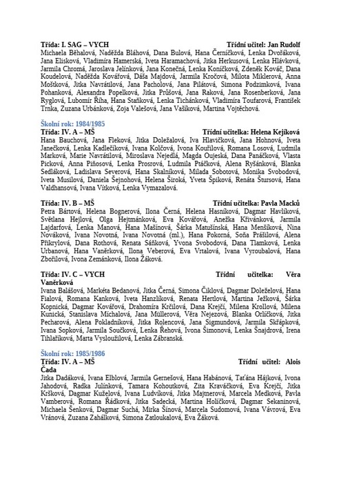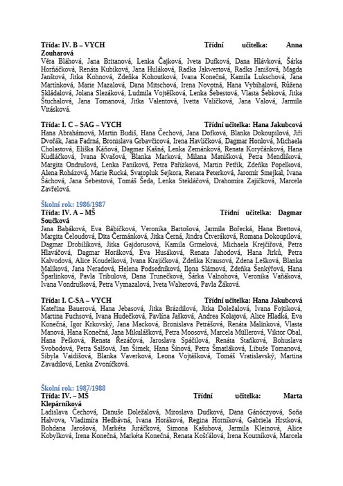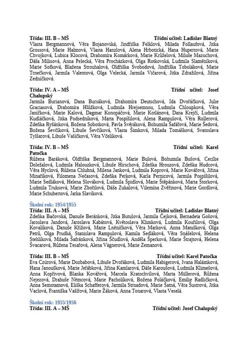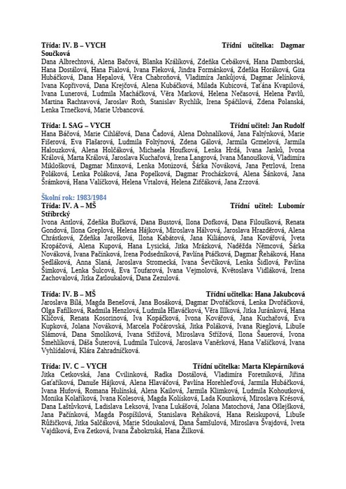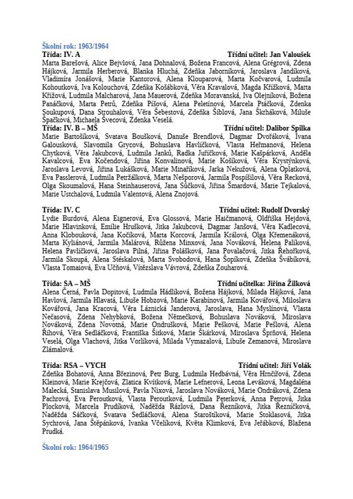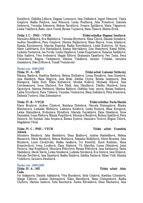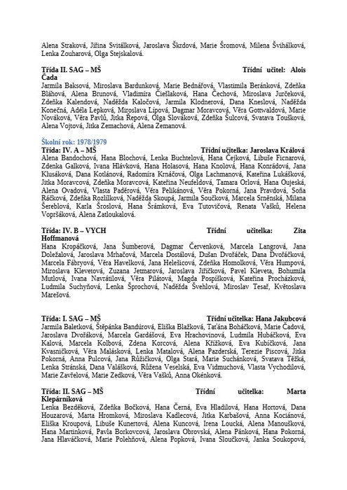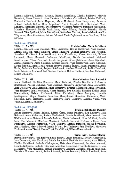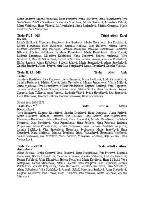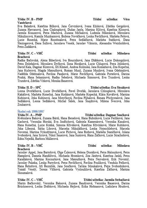 ABSOLVENTI DÁLKOVÉHO STUDIA Školní rok: 1960/1961 Třída: III. – DS Třídní učitel: Rudolf Dvorský Podzimní období: Vlasta Brodská, Jindřiška Budilová, Julie Čechová, Marie Čechovská, Jarmila Čižinská, Pěva Frišová, Václava Fiaudová, Marie Grossová, Milada Havelková, Zdenka Hansová, Božena Hofmanová, Marie Kalová, Blanka Kolářová, Zdeňka Kobylková, Marie Kostelková, Jana Malíčková, Eva Moravcová, Jaroslava Nečasová, Marie Slánská, Milada Odehnalová, Růžena Šenková, Marta Prokešová, Marie Buriánová, Eva Furchová, Milada Hejlová, Krista Holanová, Anna Kovářová, Jitka Kučerová, Štěpánka Buriánová, Vlasta Minaříková, Věra Srbová, Věra Štefková, Marcela Šustková, Pěva Täuberová, Ludmila Malčicová. Školní rok: 1962/1963 Třída: IV. A + IV. B – DS Třídní učitel: Antonín Báča Zdenka Coufalová, Zdenka Gottwaldová, Květoslava Hanzálková, Vlasta Holzerová, Jitka Hrazdírová, Ludmila Kalábová, Libuše Moláčková, Vlasta Ondrůjová, Kamila Pokorná, Alena Procházková, Blažena Prudká, Růžena Seitlová, Vlasta Slezáková, Marie Sýkorová, Helena Šíblová, Ludmila Tesařová, Marcela Vysoká, Milada Blinkalová, Milada Horáková, Ludmila Houzarová, Františka Hrůzová, Jarmila Chmelaříková, Božena Jarošová, Marie Kosíčková, Magda Kučerová, Marie Lajsová, Marie Láníková, Anna Malachová, Zdeňka Měřičková, Božena Pelantová, Naděžda Ruibarová, Ivana Ryšavá, Marie Svobodová, Marta Šiková. Třída: AK – DS Třídní učitel: Jiří Volák Podzimní období: Danuše Cupáková, Jarmila Černá, Marie Jedličková, Ludmila Kovaříková, Anna Lanžhotská, Dagmar Melkusová, Milena Švejcarová, Dobroslava Píčová, Krista Rajlichová, Eliška Schneiderová, Marie Šmidrkalová, Jana Šoustarová, Jitka Vágnerová, Alena Vodičková. Školní rok: 1963/1964 Třída: IV. + RSA – DS Třídní učitelka: Marie Bečvářová Věra Tobiášová, Božena Bárková, Ludmila Berková, Věra Hudečková, Marie Jarůšková, Miloslava Krejčová, Alice Kubíčková, Drahomíra Nebojsová, Jindřiška Pokorná, Anna Říhová, Hana Skládanková, Jaroslava Strouhová, Božena Šimková, Zdena Theimerová, Věra Kaňová, Ladislava Kučerová, Jaroslava Volejníková, Jana Antošová, Anežka Fillová, Zdena Gabčanová, Věra Hamerská, Anděla Jiráská, Irena Jurková, Květoslava Knotková, Jaroslava Mahelová, Zdenka Otevřelová, Irena Slavíková, Josefa Šukltová, Eva Truhlářová, Květa Zahradníčková. Školní rok: 1964/1965 Třída: IV. – MS – DS Třídní učitelka: Jiřina Žilková Marie Brechtová, Alena Césarová, Marie Fialová, Marie Kotrbová, Zdenka Kovářová, Marie Krahulcová, Marie Králová, Žofie Kratochvílová, Miroslava Krmíčková, Ludmila Pešíková, Karla Radkovičová, Lydie Sekaninová, Bohumila Smrčková, Marie Sochorová, Jana Stanková, Marie Vorlíková, Alena Vykydalová, Anna Saitzová. Školní rok: 1965/1966 Třída: IV. – MŠ – DS Třídní učitel: Lubomír Stříbrcký Irena Adamcová, Naděžda Ailerová, Marie Brýblová, Jarmila Bezdíčková, Teresie Darmovzalová, Edita Dvořáková, Marie Havlátová, Božena Horáková, Miroslava Charvátová, Anna Matoušková, Božena Mlčoušková, Jiřina Navrátilová, Ivana Nemétová, Alice Novotná, Božena Ondroušková, Libuše Pavlová, Milada Sedláková, Bohumila Staníčková. Školní rok: 1966/1967 Třída: IV. – MŠ – DS Třídní učitel: Lubomír Stříbrcký Podzimní období: Emílie Čechová, Svatava Drochytková, Věra Filková, Eva Gottwaldová, Marta Lanžhotská, Květoslava Kotalová, Marie Kroupová, Zdeňka Kryštofová, Miroslava Malá, Františka Maszalová, Marie Mičánková, Anna Veselá, Ludmila Pechová, Božena Mikulášková. Třída: III. SAM – DS Třídní učitel: Petr Vavřín Podzimní období: Marie Bednářová, Helena Bělohoubková, Anna Černá, Milada Doležalová, Ludmila Dušková, Eva Jeřábková, Marie Medlíková, Miroslava Mikušková, Libuše Novotná, Dagmar Pazderková, Vlasta Pitlová, Rosemarie Hrazdilová, Irena Pořízková, Vítězslava Štefková, Marie Žluvová, Marie Petrlová, Anežka Halmová, Jarmila Pospíchalová. Třída: IV. VYCH – DS Třídní učitelka: Marie Bečvařová Dobroslava Čechová, Jaroslava Dundová, Miroslav Horký, Vlasta Horská, Božena Kubová, Vlasta Nečasová, Olga Oldřichová, Zdeňka Řeháková, Libuše Sedláková, Jiřina Vorlová, Božena Špiková. Školní rok: 1967/1968 Třída: III. – VYCH – DS Třídní učitel: Petr Vavřín Drahomíra Běhounková, Svatoslava Brauková, Irena Dostálová, Marie Dostálová, Zdeňka Fialová, Lidmila Holubářová, Vlasta Kadlecová, Zdeňka Křivinková, Stanislav Macalík, Věra Malčíková, Jitka Musilová, Božena Nedělková, Zugebarg Neumannová, Ludmila Obdržálková, Marie Paděrová, Květuše Ptáčková, Jitka Roznosová, Anna Radová, Ivona Rožková, Marie Sedláčková, Marie Schilbabová, Maja Staňková, Miroslava Stejskalová, Růžena Šimanová, Edita Vejskalová, Božena Havelková, Zdinka Parmová, František Okáč, Dana Řehořková. Třída: IV. – MŠ – DS Třídní učitel: Lubomír Stříbrcký Marie Bumbová, Vlasta Cihlářová, Marta Flaišingerová, Milada Duchnanová, Zdenka Hegarová, Drahomíra Herzánová, Marie Horníčková, Vlasta Houžvová, Ludmila Keselicová, Miloslava Lublová, Františka Nekvindová, Anna Pořízková, Dana Řehořková, Anežka Stanická, Františka Vašíčková, Anna Vévodová, Jiřina Zifčáková, Ludmila Zouharová, Věra Veselá, Irma Burešová, Marie Čumrová, Věra Dvořáčková, Marie Nováková, Olga Procházková, Vlasta Smékalová, Marie Šulová, Jiřina Zbořilová, Radomír Hrbek, Olga Vrtílková, Vlasta Sedláková. Školní rok: 1968/1969 Třída: III. SA – VYCH – DS Třídní učitel: Jiří Volák Vlasta Krejčí