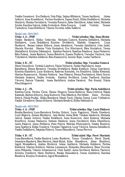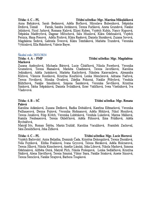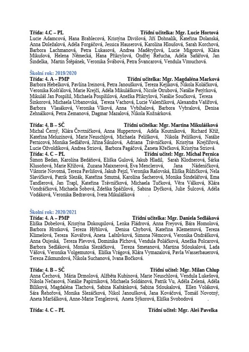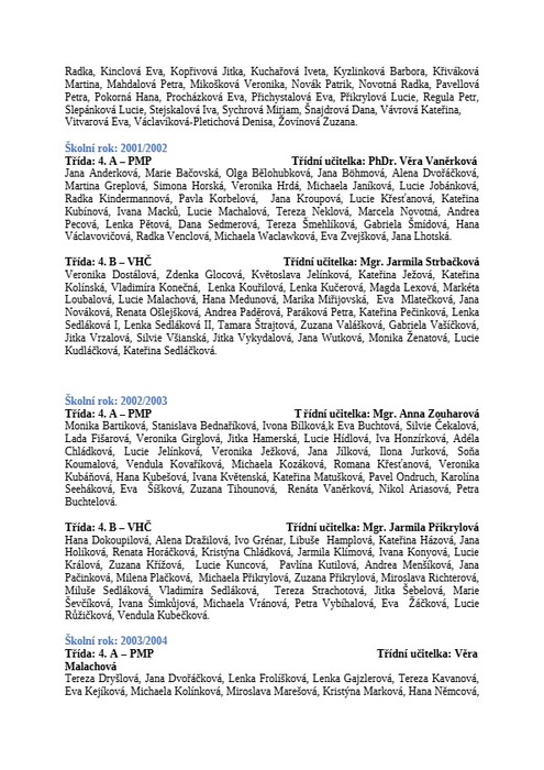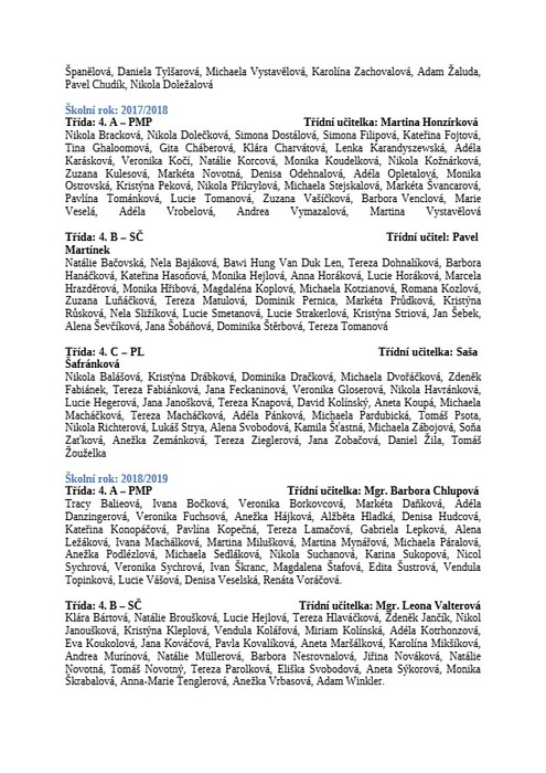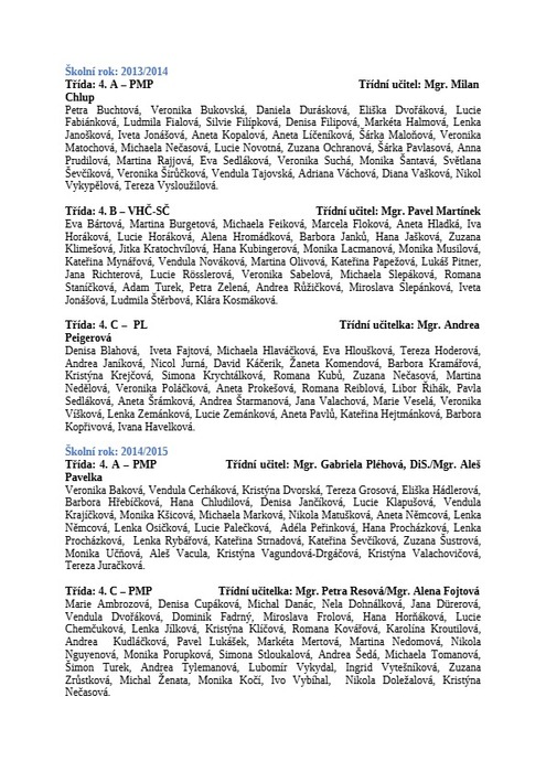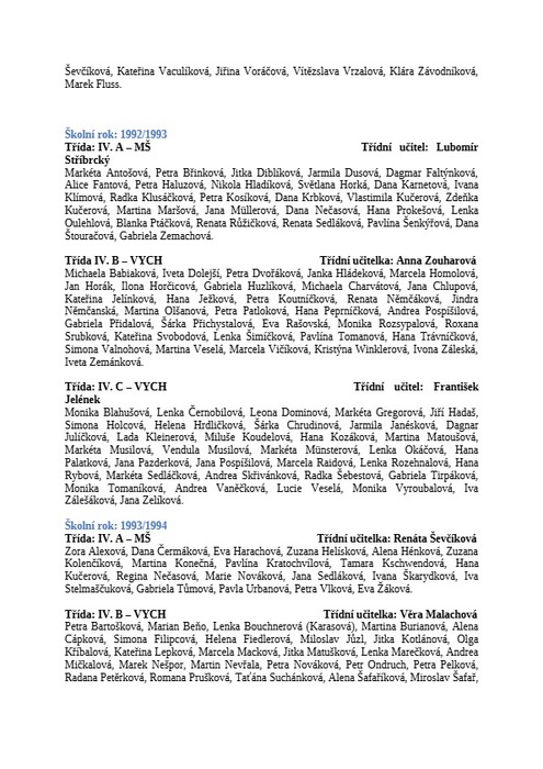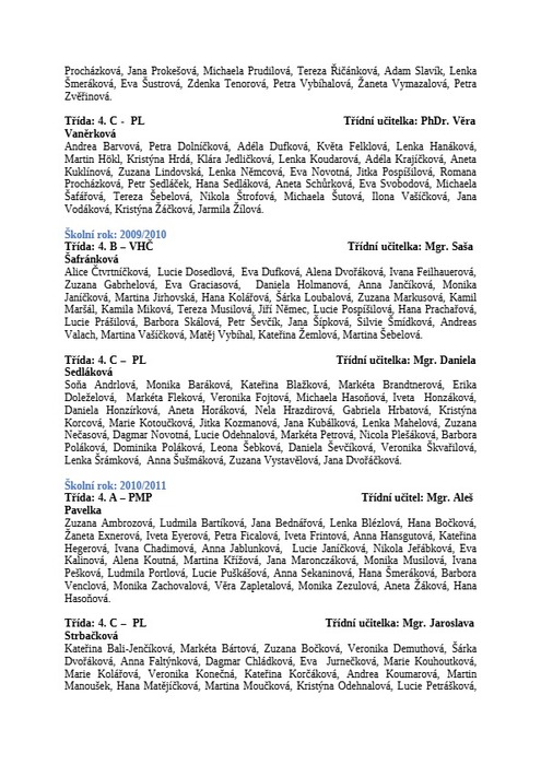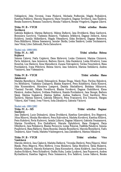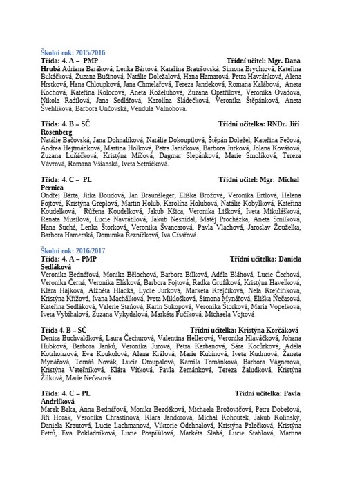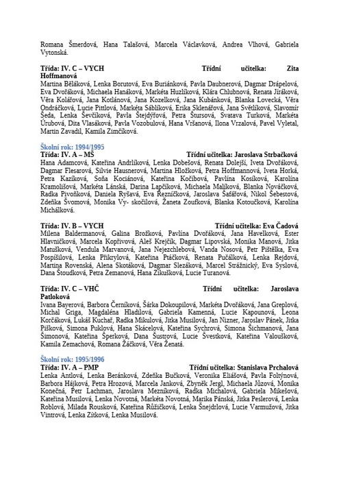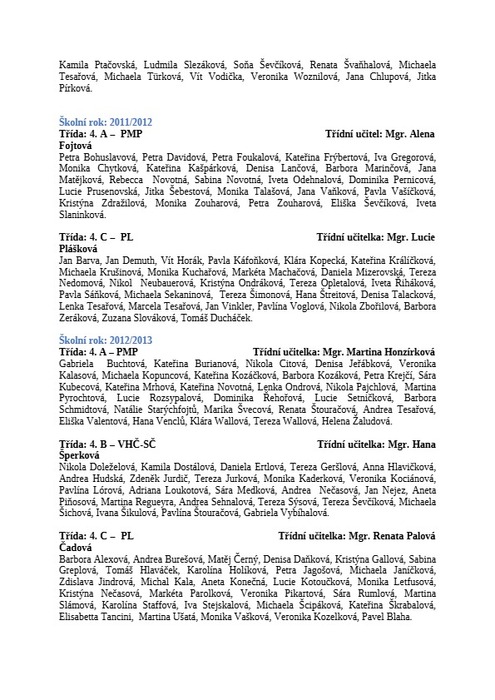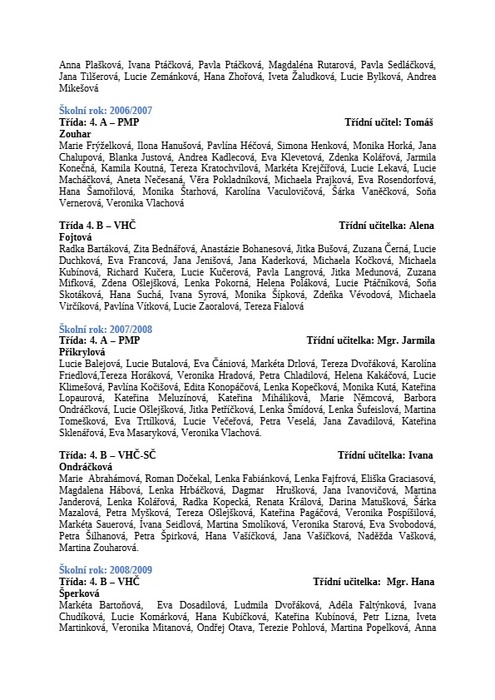 ABSOLVENTI DÁLKOVÉHO STUDIA Školní rok: 1960/1961 Třída: III. – DS Třídní učitel: Rudolf Dvorský Podzimní období: Vlasta Brodská, Jindřiška Budilová, Julie Čechová, Marie Čechovská, Jarmila Čižinská, Pěva Frišová, Václava Fiaudová, Marie Grossová, Milada Havelková, Zdenka Hansová, Božena Hofmanová, Marie Kalová, Blanka Kolářová, Zdeňka Kobylková, Marie Kostelková, Jana Malíčková, Eva Moravcová, Jaroslava Nečasová, Marie Slánská, Milada Odehnalová, Růžena Šenková, Marta Prokešová, Marie Buriánová, Eva Furchová, Milada Hejlová, Krista Holanová, Anna Kovářová, Jitka Kučerová, Štěpánka Buriánová, Vlasta Minaříková, Věra Srbová, Věra Štefková, Marcela Šustková, Pěva Täuberová, Ludmila Malčicová. Školní rok: 1962/1963 Třída: IV. A + IV. B – DS Třídní učitel: Antonín Báča Zdenka Coufalová, Zdenka Gottwaldová, Květoslava Hanzálková, Vlasta Holzerová, Jitka Hrazdírová, Ludmila Kalábová, Libuše Moláčková, Vlasta Ondrůjová, Kamila Pokorná, Alena Procházková, Blažena Prudká, Růžena Seitlová, Vlasta Slezáková, Marie Sýkorová, Helena Šíblová, Ludmila Tesařová, Marcela Vysoká, Milada Blinkalová, Milada Horáková, Ludmila Houzarová, Františka Hrůzová, Jarmila Chmelaříková, Božena Jarošová, Marie Kosíčková, Magda Kučerová, Marie Lajsová, Marie Láníková, Anna Malachová, Zdeňka Měřičková, Božena Pelantová, Naděžda Ruibarová, Ivana Ryšavá, Marie Svobodová, Marta Šiková. Třída: AK – DS Třídní učitel: Jiří Volák Podzimní období: Danuše Cupáková, Jarmila Černá, Marie Jedličková, Ludmila Kovaříková, Anna Lanžhotská, Dagmar Melkusová, Milena Švejcarová, Dobroslava Píčová, Krista Rajlichová, Eliška Schneiderová, Marie Šmidrkalová, Jana Šoustarová, Jitka Vágnerová, Alena Vodičková. Školní rok: 1963/1964 Třída: IV. + RSA – DS Třídní učitelka: Marie Bečvářová Věra Tobiášová, Božena Bárková, Ludmila Berková, Věra Hudečková, Marie Jarůšková, Miloslava Krejčová, Alice Kubíčková, Drahomíra Nebojsová, Jindřiška Pokorná, Anna Říhová, Hana Skládanková, Jaroslava Strouhová, Božena Šimková, Zdena Theimerová, Věra Kaňová, Ladislava Kučerová, Jaroslava Volejníková, Jana Antošová, Anežka Fillová, Zdena Gabčanová, Věra Hamerská, Anděla Jiráská, Irena Jurková, Květoslava Knotková, Jaroslava Mahelová, Zdenka Otevřelová, Irena Slavíková, Josefa Šukltová, Eva Truhlářová, Květa Zahradníčková. Školní rok: 1964/1965 Třída: IV. – MS – DS Třídní učitelka: Jiřina Žilková Marie Brechtová, Alena Césarová, Marie Fialová, Marie Kotrbová, Zdenka Kovářová, Marie Krahulcová, Marie Králová, Žofie Kratochvílová, Miroslava Krmíčková, Ludmila Pešíková, Karla Radkovičová, Lydie Sekaninová, Bohumila Smrčková, Marie Sochorová, Jana Stanková, Marie Vorlíková, Alena Vykydalová, Anna Saitzová. Školní rok: 1965/1966 Třída: IV. – MŠ – DS Třídní učitel: Lubomír Stříbrcký Irena Adamcová, Naděžda Ailerová, Marie Brýblová, Jarmila Bezdíčková, Teresie Darmovzalová, Edita Dvořáková, Marie Havlátová, Božena Horáková, Miroslava Charvátová, Anna Matoušková, Božena Mlčoušková, Jiřina Navrátilová, Ivana Nemétová, Alice Novotná, Božena Ondroušková, Libuše Pavlová, Milada Sedláková, Bohumila Staníčková. Školní rok: 1966/1967 Třída: IV. – MŠ – DS Třídní učitel: Lubomír Stříbrcký Podzimní období: Emílie Čechová, Svatava Drochytková, Věra Filková, Eva Gottwaldová, Marta Lanžhotská, Květoslava Kotalová, Marie Kroupová, Zdeňka Kryštofová, Miroslava Malá, Františka Maszalová, Marie Mičánková, Anna Veselá, Ludmila Pechová, Božena Mikulášková. Třída: III. SAM – DS Třídní učitel: Petr Vavřín Podzimní období: Marie Bednářová, Helena Bělohoubková, Anna Černá, Milada Doležalová, Ludmila Dušková, Eva Jeřábková, Marie Medlíková, Miroslava Mikušková, Libuše Novotná, Dagmar Pazderková, Vlasta Pitlová, Rosemarie Hrazdilová, Irena Pořízková, Vítězslava Štefková, Marie Žluvová, Marie Petrlová, Anežka Halmová, Jarmila Pospíchalová. Třída: IV. VYCH – DS Třídní učitelka: Marie Bečvařová Dobroslava Čechová, Jaroslava Dundová, Miroslav Horký, Vlasta Horská, Božena Kubová, Vlasta Nečasová, Olga Oldřichová, Zdeňka Řeháková, Libuše Sedláková, Jiřina Vorlová, Božena Špiková. Školní rok: 1967/1968 Třída: III. – VYCH – DS Třídní učitel: Petr Vavřín Drahomíra Běhounková, Svatoslava Brauková, Irena Dostálová, Marie Dostálová, Zdeňka Fialová, Lidmila Holubářová, Vlasta Kadlecová, Zdeňka Křivinková, Stanislav Macalík, Věra Malčíková, Jitka Musilová, Božena Nedělková, Zugebarg Neumannová, Ludmila Obdržálková, Marie Paděrová, Květuše Ptáčková, Jitka Roznosová, Anna Radová, Ivona Rožková, Marie Sedláčková, Marie Schilbabová, Maja Staňková, Miroslava Stejskalová, Růžena Šimanová, Edita Vejskalová, Božena Havelková, Zdinka Parmová, František Okáč, Dana Řehořková. Třída: IV. – MŠ – DS Třídní učitel: Lubomír Stříbrcký Marie Bumbová, Vlasta Cihlářová, Marta Flaišingerová, Milada Duchnanová, Zdenka Hegarová, Drahomíra Herzánová, Marie Horníčková, Vlasta Houžvová, Ludmila Keselicová, Miloslava Lublová, Františka Nekvindová, Anna Pořízková, Dana Řehořková, Anežka Stanická, Františka Vašíčková, Anna Vévodová, Jiřina Zifčáková, Ludmila Zouharová, Věra Veselá, Irma Burešová, Marie Čumrová, Věra Dvořáčková, Marie Nováková, Olga Procházková, Vlasta Smékalová, Marie Šulová, Jiřina Zbořilová, Radomír Hrbek, Olga Vrtílková, Vlasta Sedláková. Školní rok: 1968/1969 Třída: III. SA – VYCH – DS Třídní učitel: Jiří Volák Vlasta Krejčí